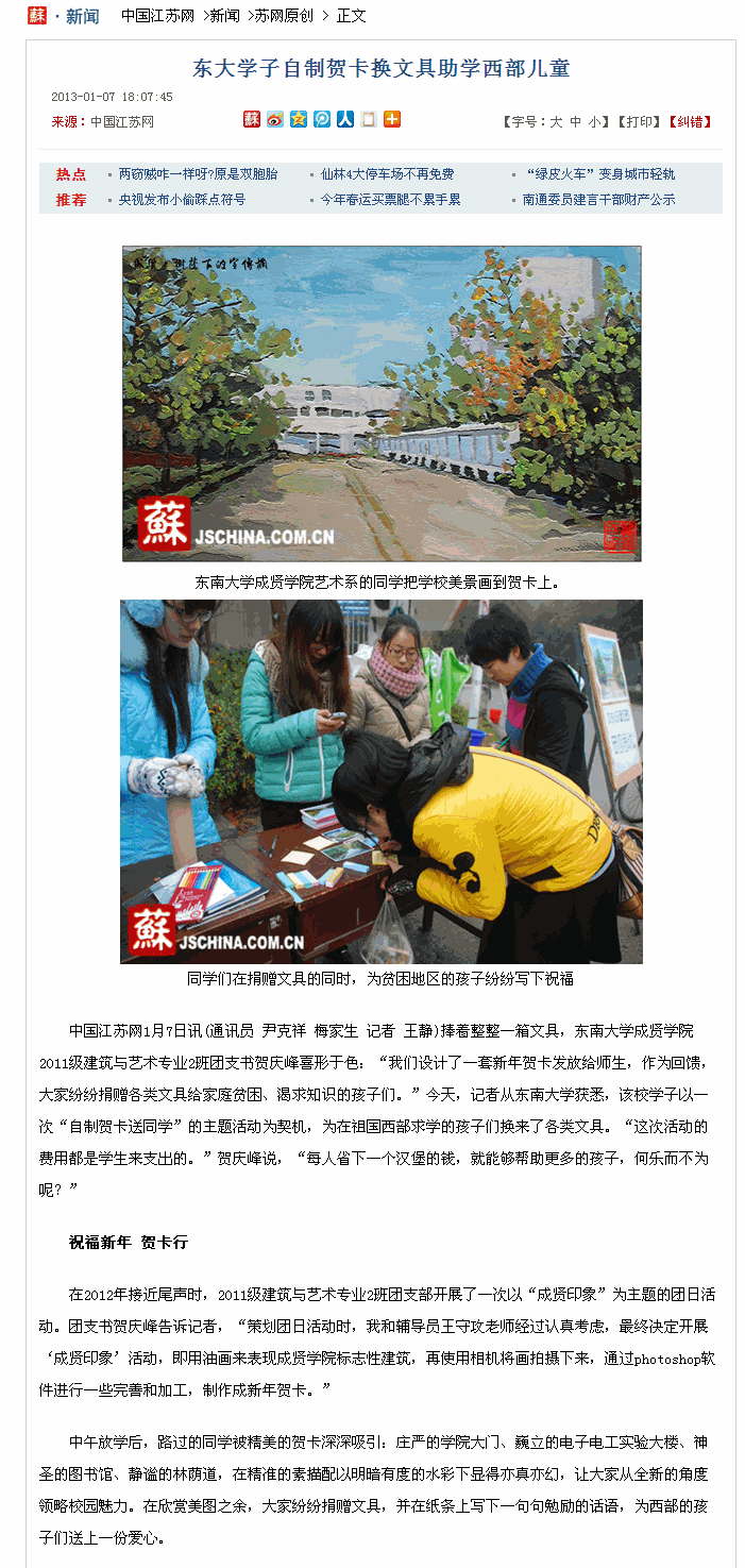 【中国江苏网】成贤学子自制贺卡换文具助学西部儿童