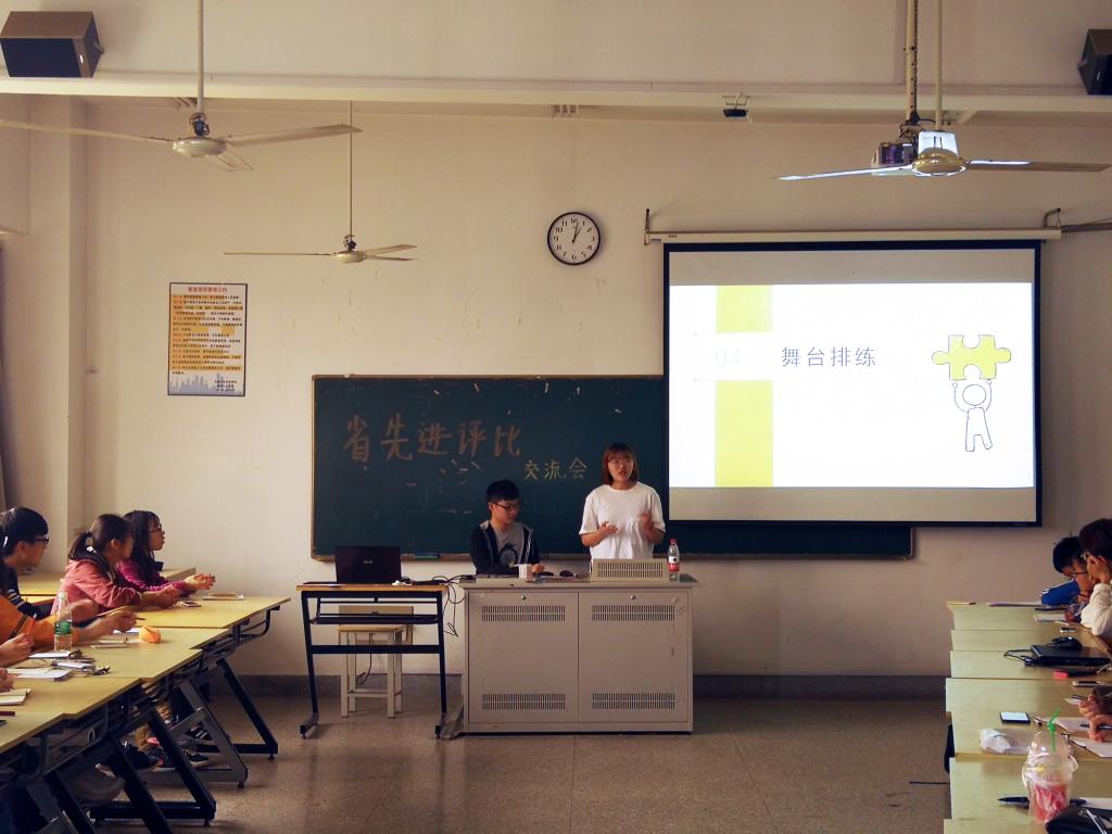 建筑学一班的骨干们依次从主讲人、视频制作、道具准备和舞台排练四个方面介绍了评比工作、整个过程的筹备、组织、总结以及对于班级管理提出的独特见解,强调了一个班级最重要的就是凝聚力。