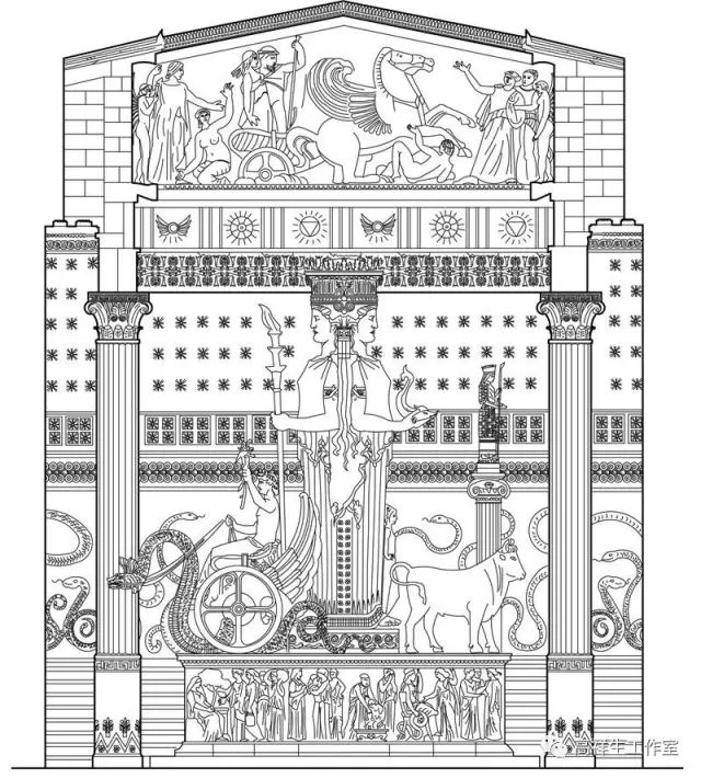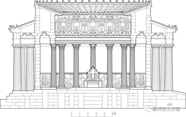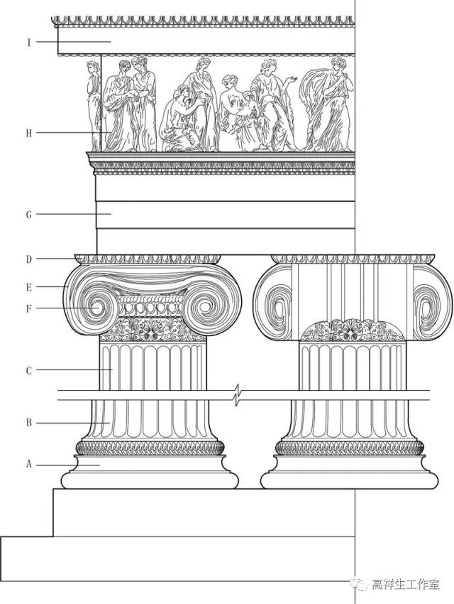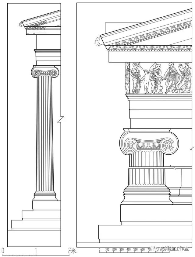 图6古希腊建筑的爱奥尼柱式。该图由高祥生工作室根据法国巴黎美术公司成立一百周年之际时该校师生测绘后复原的渲染图重新以CAD形式绘制