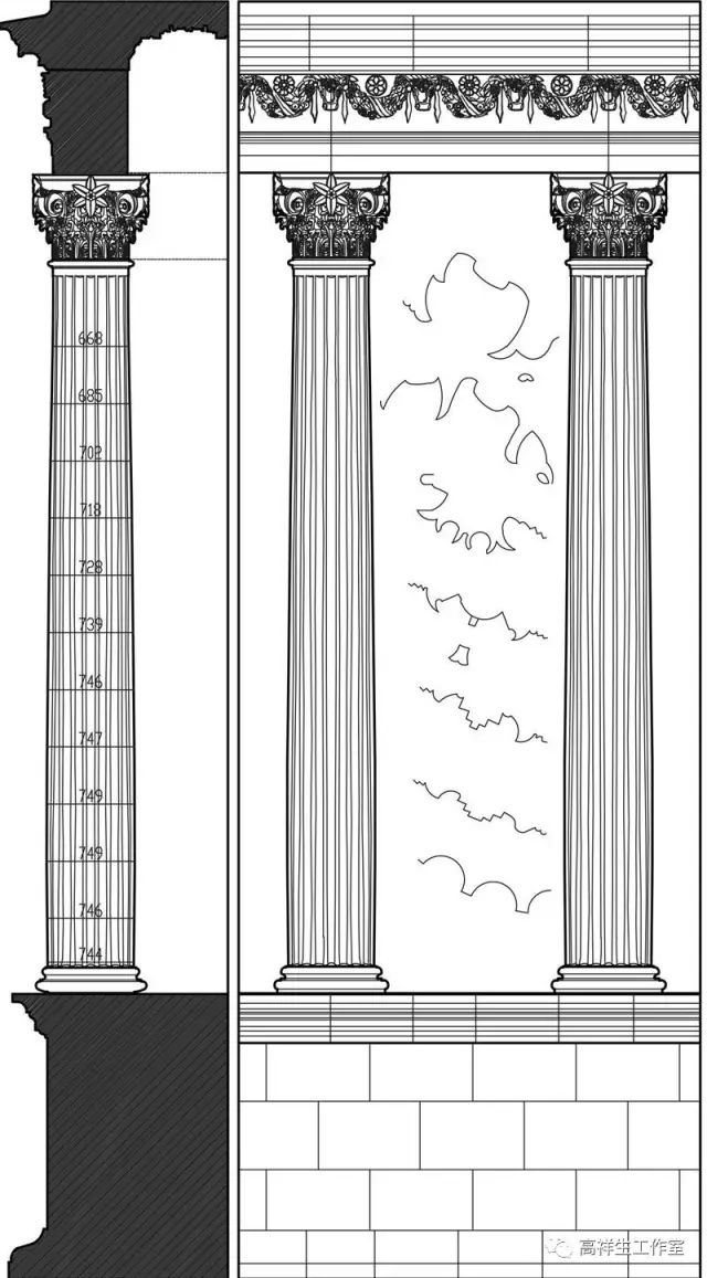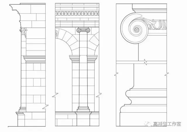 图37罗马法尔尼斯府邸券柱子。该图由高祥生工作室根据法国巴黎美术公司成立一百周年之际时该校师生测绘后复原的渲染图重新以CAD形式绘制