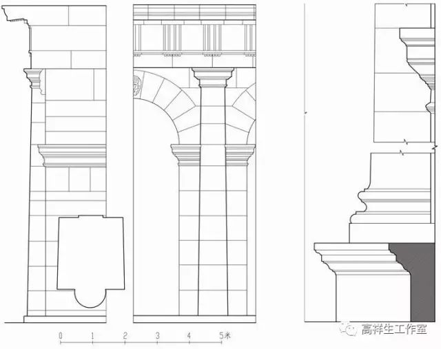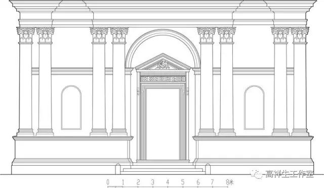 图35罗马法尔尼斯府邸券柱。该图由高祥生工作室根据法国巴黎美术公司成立一百周年之际时该校师生测绘后复原的渲染图重新以CAD形式绘制