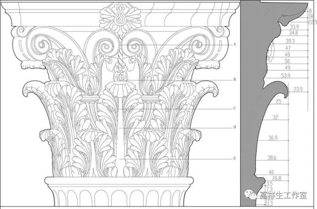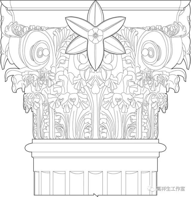 图11古希腊建筑的科林新柱式。该图由高祥生工作室根据法国巴黎美术公司成立一百周年之际时该校师生测绘后复原的渲染图重新以CAD形式绘制