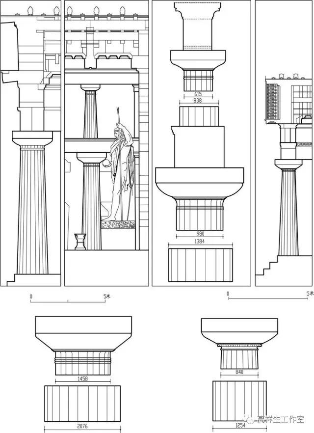 图7古希腊爱奥尼柱式的收分。该图由高祥生工作室根据法国巴黎美术公司成立一百周年之际时该校师生测绘后复原的渲染图重新以CAD形式绘制