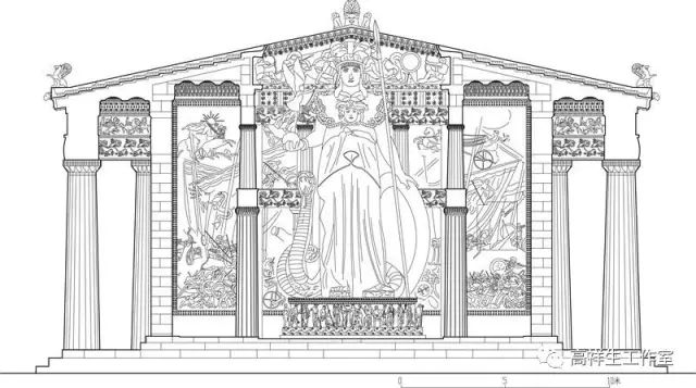 图1古希腊建造的多立克柱式。该图由高祥生工作室根据法国巴黎美术公司成立一百周年之际时该校师生测绘后复原的渲染图重新以CAD形式绘制
