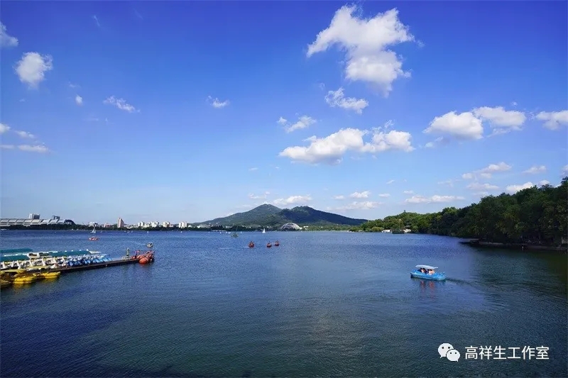 眺望湖面、远山、远景,呈现一幅开阔、舒展、大气的图面:蓝灰色的紫金山,九华山衬托着远处的白色的建筑,衬托着钴蓝色的湖面。湖面上来往穿行着几条明黄色的游艇,游艇划开的水面留下几道白色的水浪。这蓝色的天空,淡灰色的山体,与黄色的游艇,与湖岸上的建筑、植物、小品和游人构成了一幅阳光明媚的图画。