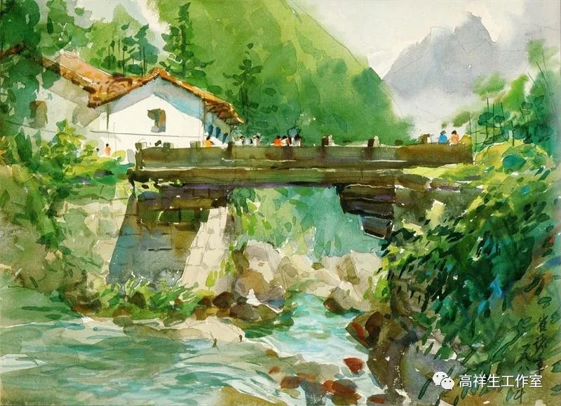 四十多年前,我随崔老师去安徽九华山画画,画了一批九华山风景的水彩画。这幅水彩表现的重点是石桥、溪流和小屋子。为了突出画面主体,崔老师将实际距离不远的山头,远树虚化了,将近处的石桥、山石与灌木加深了,进而从明度上拉开画面中“主体”与“客体”的对比关系,而后又夸张地将小房子屋顶的饱和度提高,将侧墙落影的明度对比加大,使人们注意力很快就集中到小桥、房子、溪流位置。值得一提的是崔老师在水彩画暗部时既能将明度关系拉开,又能将暗部的明度画得很透明,这是崔老师在水彩画长期实践中形成的经验(图 7)。