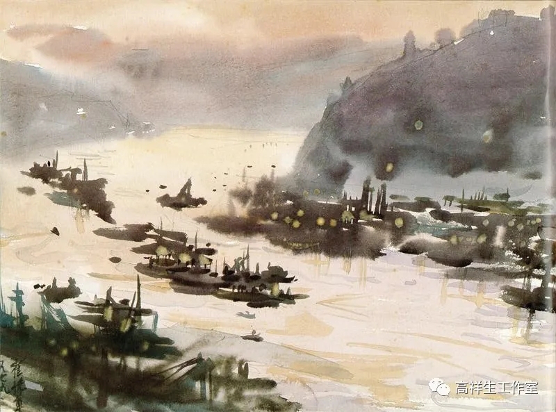70 年代末 80 年代初是崔老师水彩写生的高峰期,《嘉陵江夕照》是在这高峰期中的精品。作画过程中,崔老师将嘉陵江畔的山域、嘉陵江的船只尽收眼底,对这样一个壮观、繁杂的景观,崔老师缜密地考虑了画面的主次问题、虚实问题以及水彩的表现方法,最终完成了这幅形神兼备、气韵生动的杰作。
