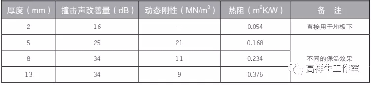不同于传统的电子交联发泡聚乙烯材料,新型地面隔声保温毡由电子交联发泡聚乙烯和特殊聚酯纤维复合而成,得益于专有微小均匀发泡技术,新型地面隔声保温毡由封闭式微孔结构构成,即使在长期荷载的情形下,隔声毡也不会发生气泡破裂和损坏,从而导致隔声效果的降低。根据使用要求的不同,地面隔声毡具有多种规格,2 mm、5 mm、8 mm、13 mm。具体参数见表 11-1。