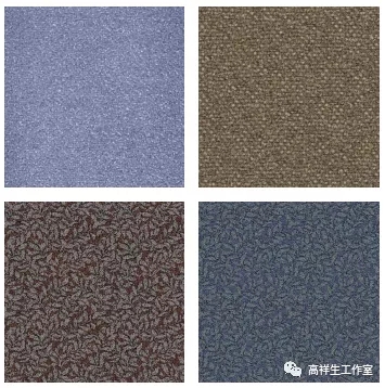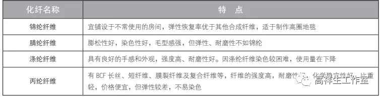 化纤地毯以化学纤维为主要原料制成。与纯毛地毯相比,具有轻质、耐磨、色彩鲜艳、更富弹性、铺设简便等优点(图 10-1-6 至图 10-1-8),而且价格比较低廉。化纤地毯所用化纤原料有锦纶、腈纶、涤纶、丙纶等,各种材料有不同特点,具体见表 10-3 所示。