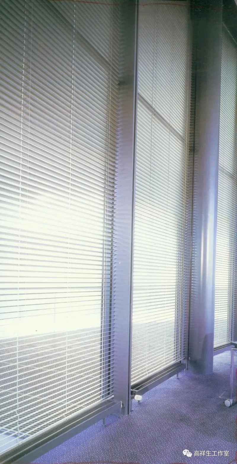 它有水平叶片式和垂直叶片式两种类型,特点是借改变帘面条形叶片的角度来调节室内的采光与通风。叶片的材质有的用麻类织物,也有的采用铝、雕塑、竹、木等非织物,其现代感强,适应性广,无论是公共建筑还是居室均可采用,尤其适用于办公建筑(图 10-1-17)。