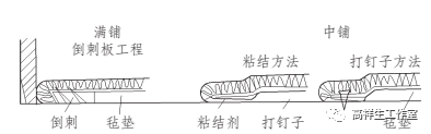 为保证地毯展平后不因外力而变形,多数情况下需加以固定。固定的方法有两种,一是用挂毯条固定;二是粘结固定。