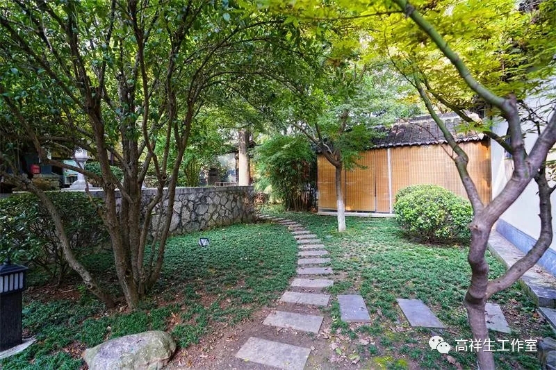 一殿大厅与二殿大厅之间有个约三十平方米,呈扁形,在东西两廊之间呈对称、封闭式的向心庭院。庭院设两层地台,上层铺方青石,左右各立石灯一对。庭院中的草坪以麦冬、石楠组成数片,汀步曲径。龙柏、女贞、桂花、鸡爪槭、枇杷、马褂木、木本绣球佇立,海桐、紫薇、红花檵木、孝顺竹……灌木点缀,院内青茵如毯,绿荫簇拥,显得端庄、怡静、雅致。