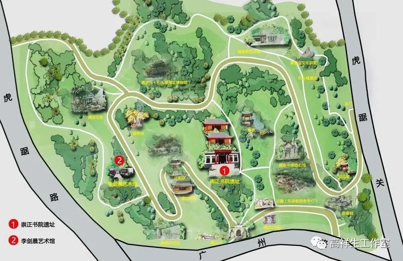 图1 崇正书院和李剑晨艺术馆的位置表示 高祥生工作室根据导游图绘制