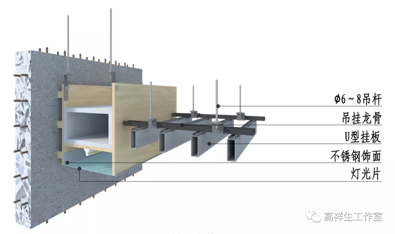 图 13-3-23 U 型挂板与灯箱顶棚交接构造节点图