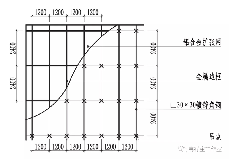 图 13-3-19 铝格栅顶棚构造节点图
