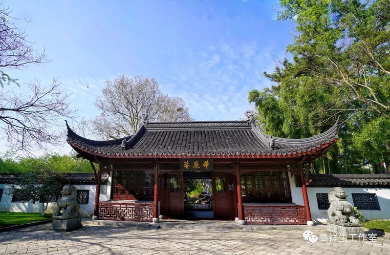 进入莫愁湖公园后绕过月牙池,有小径连通华严庵。现在的华严庵主要有门面和庭院。华严庵的门面为三开间,端庄,大方,左右设石狮两尊,威严、静穆,屋面青瓦铺贴,飞檐起翘。我曾多次带员工在华严庵内作建筑写生,至今印象深刻。华严庵内卵石铺地,花纹精美,庵内中央耸立一块硕大的湖石,玲珑剔透、气宇轩昂,足以与苏州留园的湖石“冠云峰”比美。华严庵庵内绿荫环抱,庵内西侧廊道通彻,廊柱成排,西侧有门洞通往莫愁女故居,东侧有入口可达棋文馆。