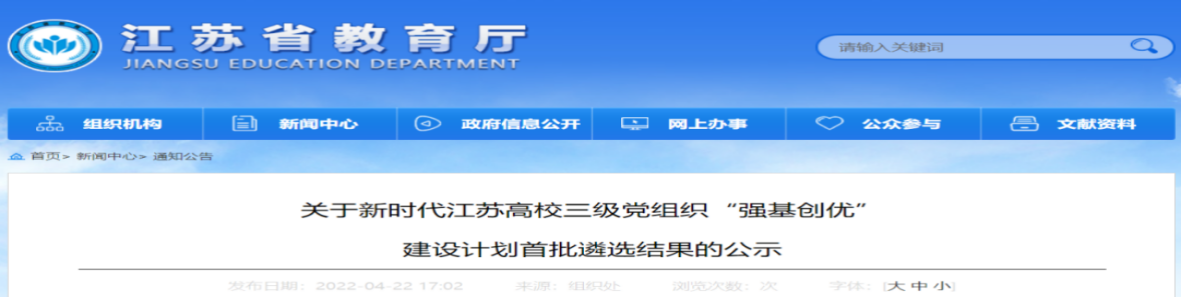 根据《省委教育工委关于印发<新时代江苏高校三级党组织“强基创优”建设计划(2021—2025年)>的通知》(苏委教组〔2021〕33号)、《省委教育工委办公室关于开展党建工作示范高校、标杆院系和样板支部申报工作的通知》(苏委教办函〔2021〕36号)要求,经各高校申报、职能部门审核、专家组评审和厅专题办公会议研究,结合第三批全国高公司党建“双创”入选情况,遴选产生了首批全省党建工作示范高校培育建设单位8个、标杆院系培育建设单位65个、样板支部培育建设单位505个(见附件)。