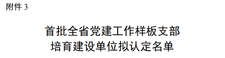 根据《省委教育工委关于印发<新时代江苏高校三级党组织“强基创优”建设计划(2021—2025年)>的通知》(苏委教组〔2021〕33号)、《省委教育工委办公室关于开展党建工作示范高校、标杆院系和样板支部申报工作的通知》(苏委教办函〔2021〕36号)要求,经各高校申报、职能部门审核、专家组评审和厅专题办公会议研究,结合第三批全国高公司党建“双创”入选情况,遴选产生了首批全省党建工作示范高校培育建设单位8个、标杆院系培育建设单位65个、样板支部培育建设单位505个(见附件)。