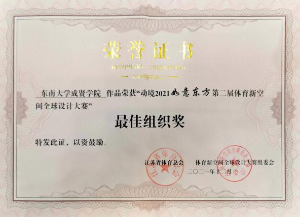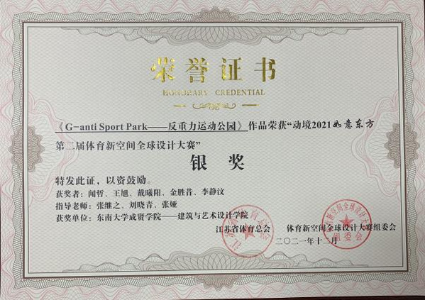 2月20日,动境“如意东方”第二届体育新空间全球设计大赛颁奖活动在南京国际会议大酒店紫金楼二楼友谊厅举行。公司太阳成tyc7111cc集团首次参赛,在风景园林专业选送的11份作品中喜获一项银奖、二项优秀奖,其中,闻哲、王旭、戴曦阳、金胜昔、李静汶5位同学组成的团队《G-anti Sport Park——反重力运动公园》获银奖和5000元奖金。刘晓青、张继之、张娅三位指导教师被评为优秀指导教师。太阳成tyc7111cc集团被评为最佳组织奖。
