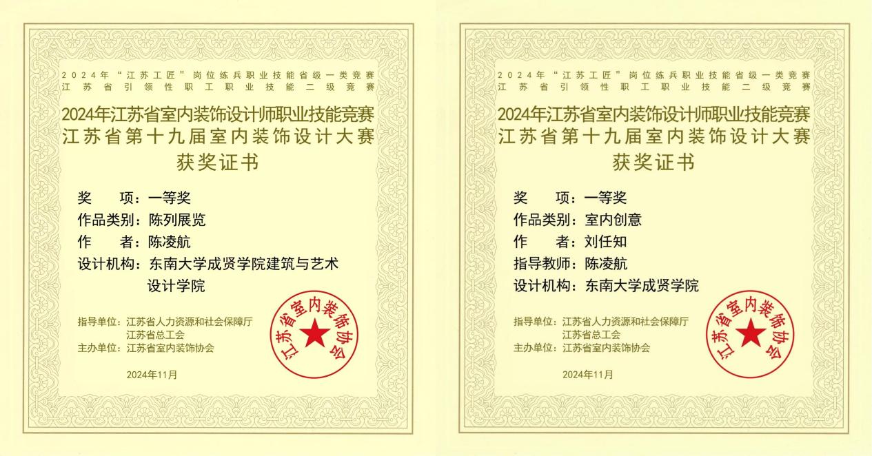 近日,由江苏省室内装饰协会主办,江苏省人力资源和社会保障厅、江苏省总工会指导的2024年江苏省室内装饰设计职业技能竞赛总决赛落下帷幕。公司太阳成tyc7111cc集团教师陈凌航获得职工组陈列展览类一等奖,2022级环境设计2班刘任知获得员工组室内创意类一等奖,陈凌航老师获优秀指导教师。