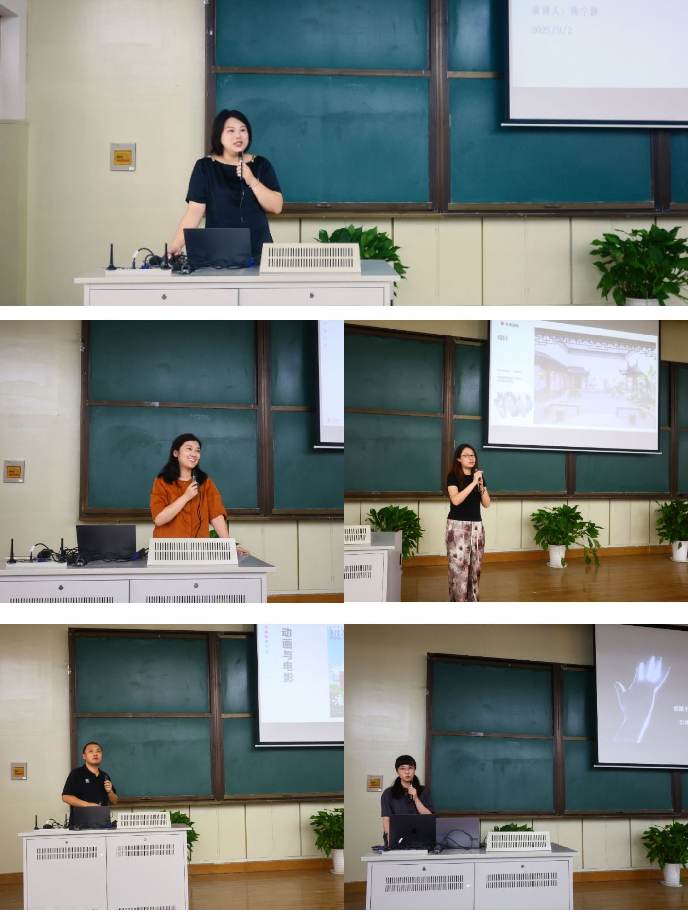陈宁静、芮潇、刘晓青、张庆、陈晓青五位老师分别就建筑学、环境设计、风景园林、数字媒体艺术和视觉传达设计专业进行了系统介绍。陈宁静老师以古今建筑演进为主线,强调了建筑既是空间的塑造,更是文化、技术与艺术三者的深度交融与表达;芮潇老师通过光影、色彩与肌理等实际案例,阐释了环境设计如何借助材料语言与空间动线;刘晓青老师以中式美学与生态实践为双重视角,引导员工思考风景园林如何协调自然生态与公共需求;张庆老师结合虚拟现实、人工智能及交互技术等前沿应用,展现了数字媒体艺术在沉浸体验与智能创作中的无限可能;陈晓青老师通过系列案例,展现了视觉传达设计在文化、技术与创新上的多维特质。